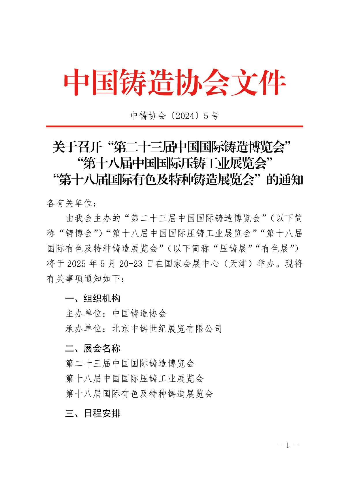 【協會活動】關于召開“第二十三屆中國國際鑄造博覽會”“第十八屆中國國際壓鑄工業展覽會”“第十八屆國際有色及特種鑄造展覽會”的通知