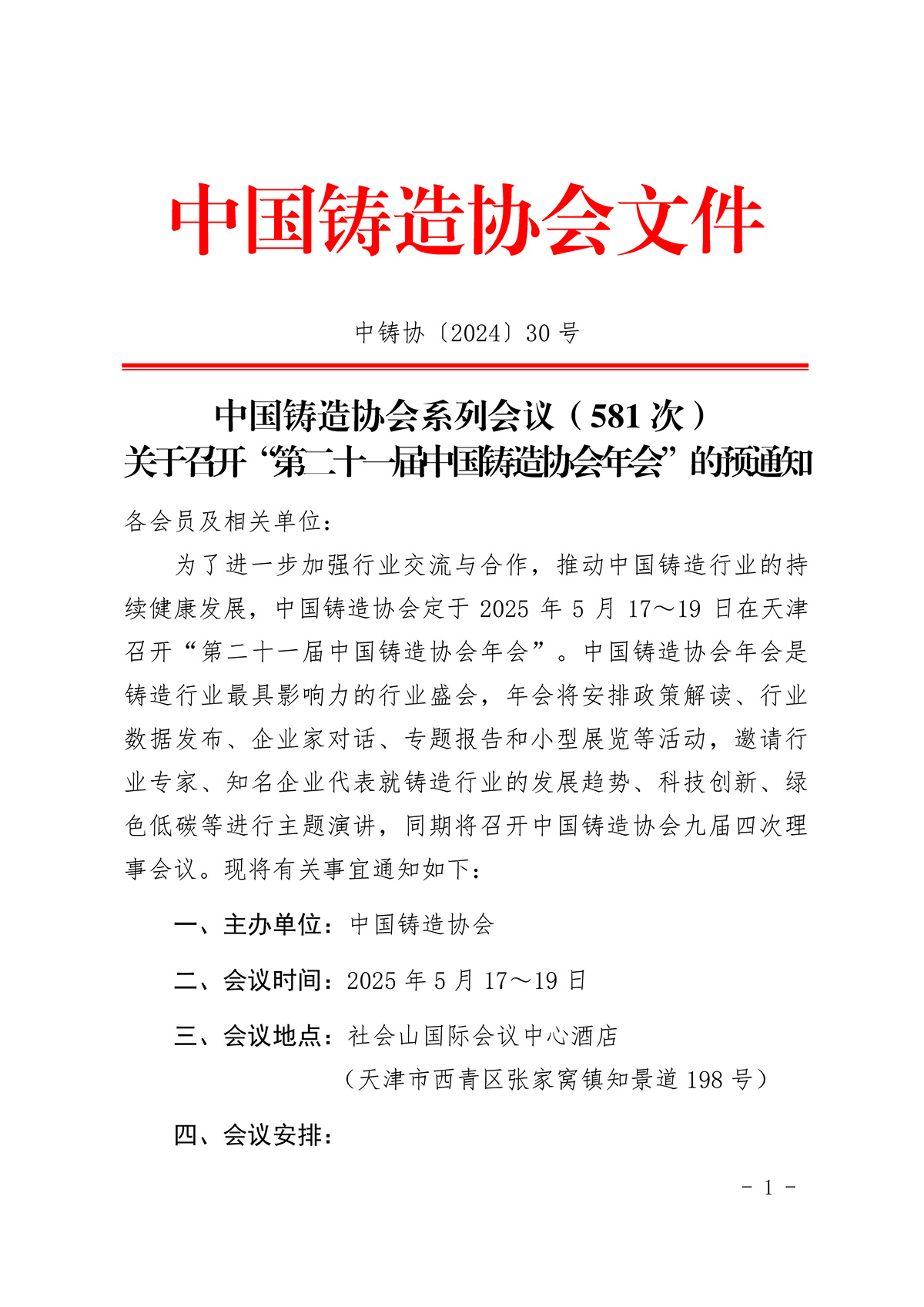 【協會活動】關于召開“第二十一屆中國鑄造協會年會”的預通知